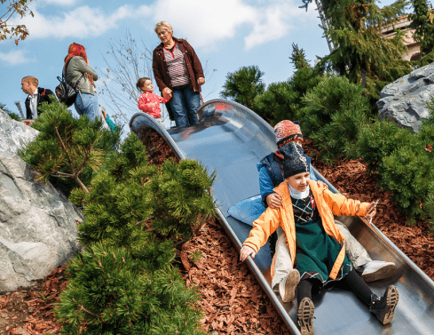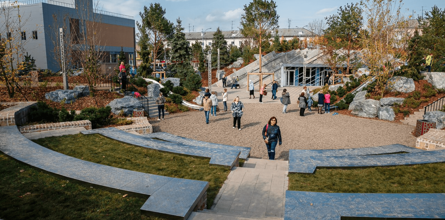 Детская площадка с двумя горками выполнена в виде амфитеатра, стены которого оформлены гранитным камнем.