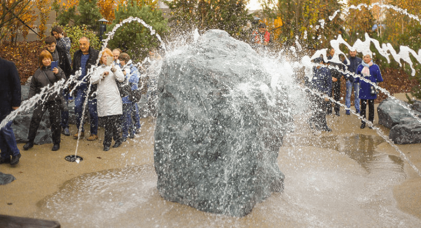 Фонтан сделан по принципу подземных гейзеров, вода бьёт прямо из-под земли.