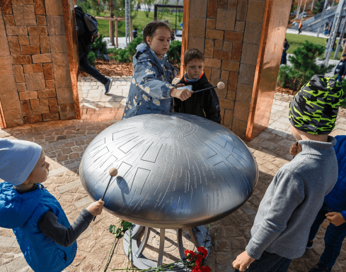 Здесь установлен музыкальный арт-объект Angel Drum авторского дизайна – уникальный и единственный в своем роде инструмент, самый крупный лепестковый барабан в мире!