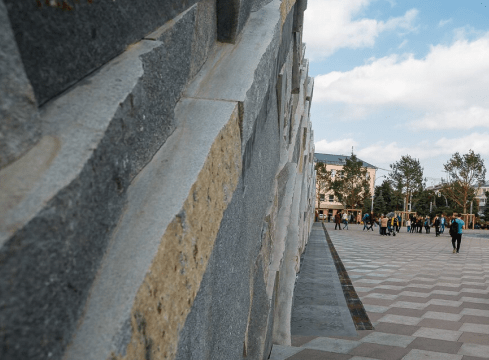 В виде скальной породы, выходящей из земли, представляет собой шестидесятиметровую стену, отделанную гранитными блоками. В основании расположена чаша фонтана, покрытая декоративной решеткой из нержавеющей стали.