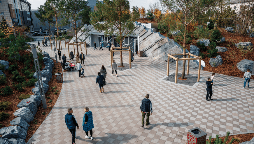 Искусственные холмы используются как основные проектные элементы – обеспечивают защитный буфер от шума городской жизни.