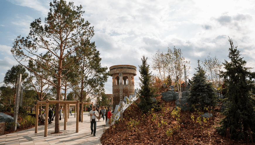 Парк обыгрывает особенности естественного ландшафта Кемерова с помощью открытых пространств для детей.